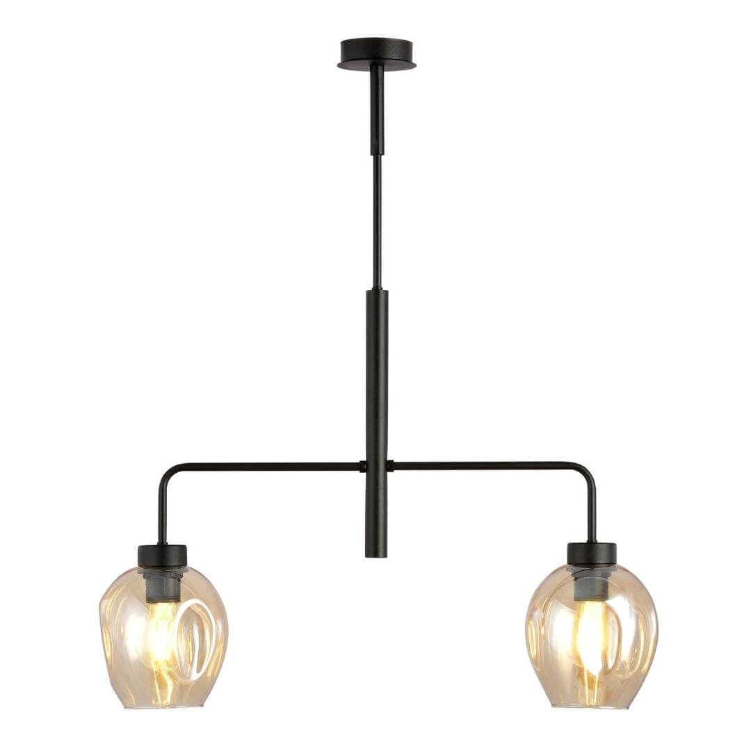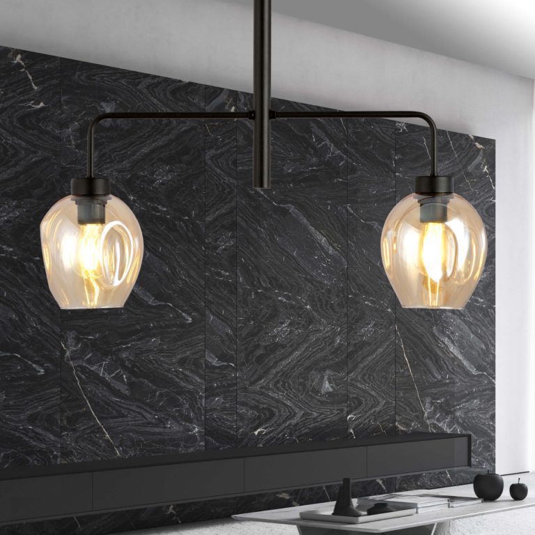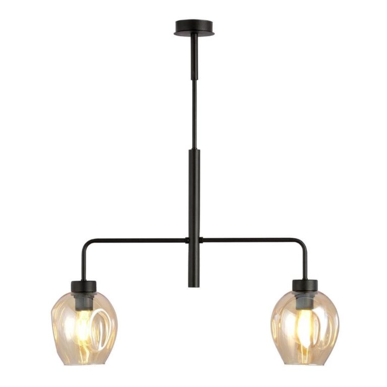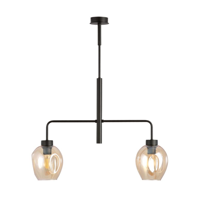 Dwupłomienna lampa sufitowa Dan 2 wyposażona jest również w solidny stelaż z ramionami skierowanymi ku dołowi pod kątem prostym. Cała konstrukcja wykonana została ze stali lakierowanej na czarno, który tworzy idealne tło dla miodowych kloszy. Opisywane oświetlenie do wnętrz Dan 2 idealnie pasuje do aranżacji industrialnych i loftowych, w których często wykorzystuje się kolorowe szkło oraz czarny metal. Jest to jednak również propozycja, którą możesz wykorzystać, jako element wystroju nowoczesnego, eklektycznego, czy nawet glamour.