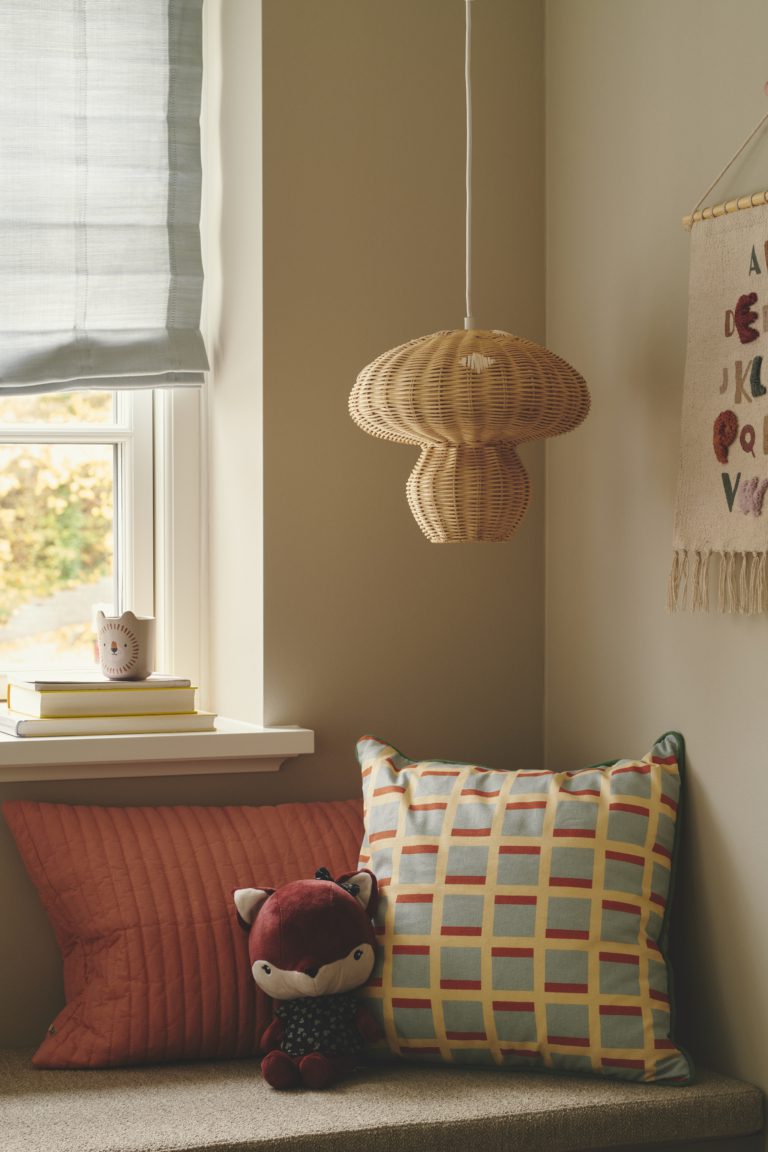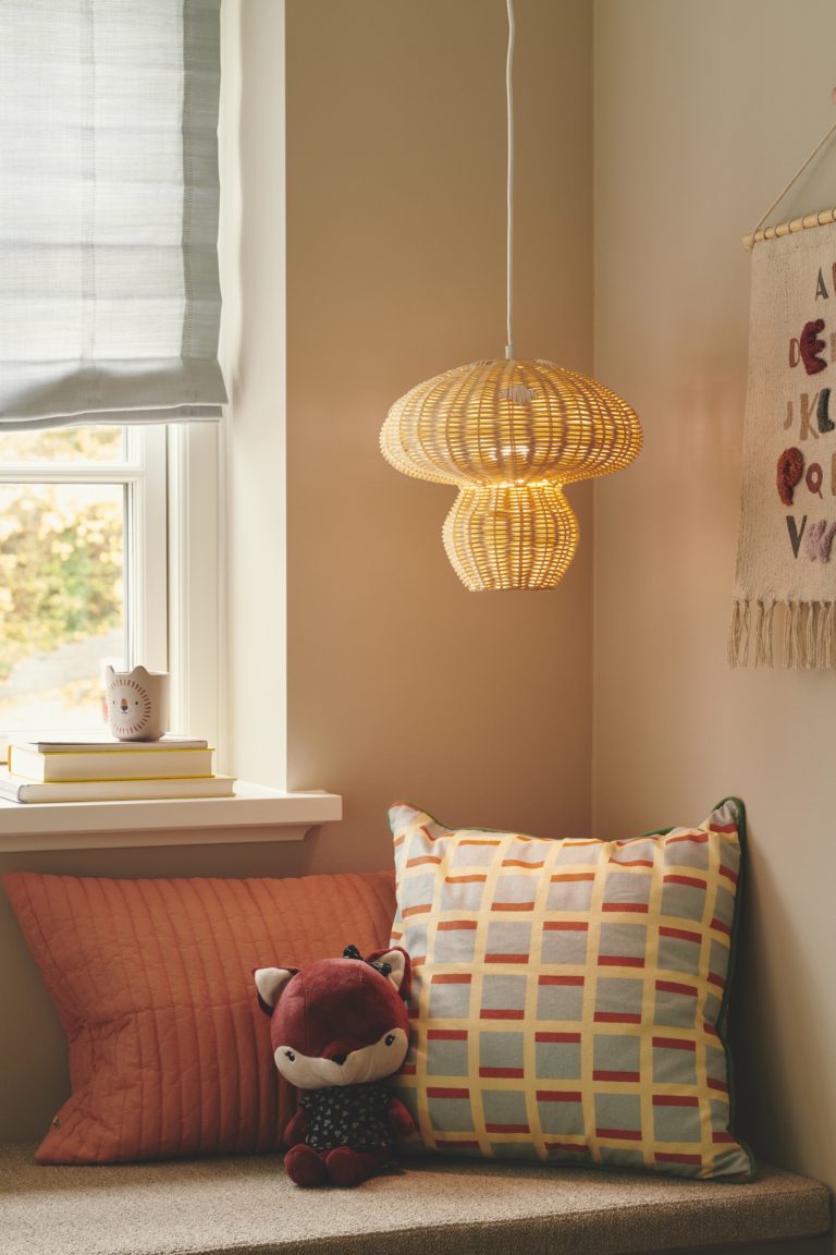 Dziecięca lampa wisząca Allie Nature w nowoczesnym stylu to przede wszystkim, wspomniany już wyżej, klosz. Abażur przypomina wyglądem leśnego grzybka, w którego wnętrzu kryje się oprawka na jedną żarówkę. Lampa z kloszem z rattanowej plecionki przepięknie rozprasza światło, wypełniając całe wnętrze przyjazną atmosferą. Do modelu warto dobrać żarówkę o ciepłej barwie światła, która dodatkowo ociepli wizualnie przestrzeń. Lampa wisząca dla dzieci Allie Nature pozwala także na zastosowanie ściemnialnych żarówek.