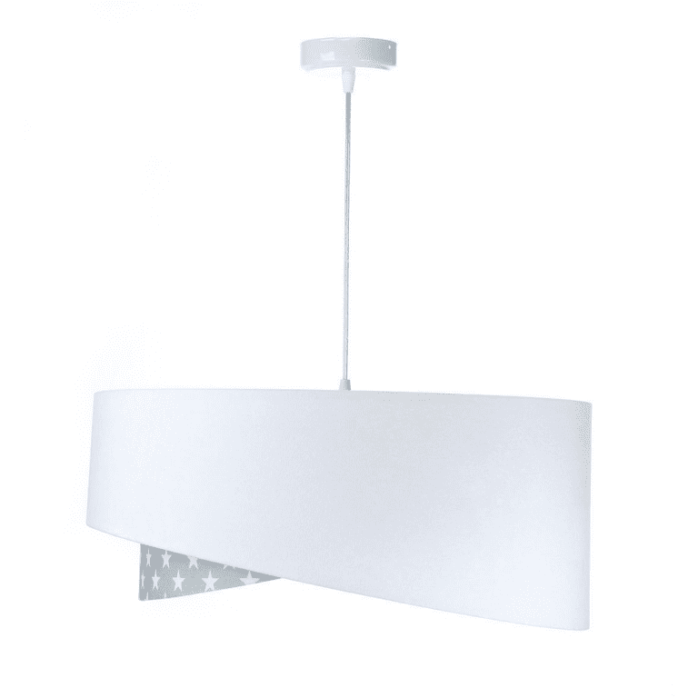 Dziecięca lampa wisząca ma bardzo ciekawą asymetryczną kompozycję. Składa się z podwójnego klosza z efektownymi skośnymi liniami, eleganckiej białej podsufitki oraz transparentnego kabla, którego długość jest regulowana. Dzięki temu lampę zawiesić możesz w odległości zarówno 35 cm, jak i 105 cm od sufitu. Średnica zewnętrznego klosza wynosi 50 cm, a jego wysokość równa się 23 cm.