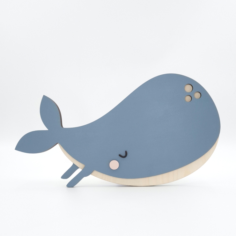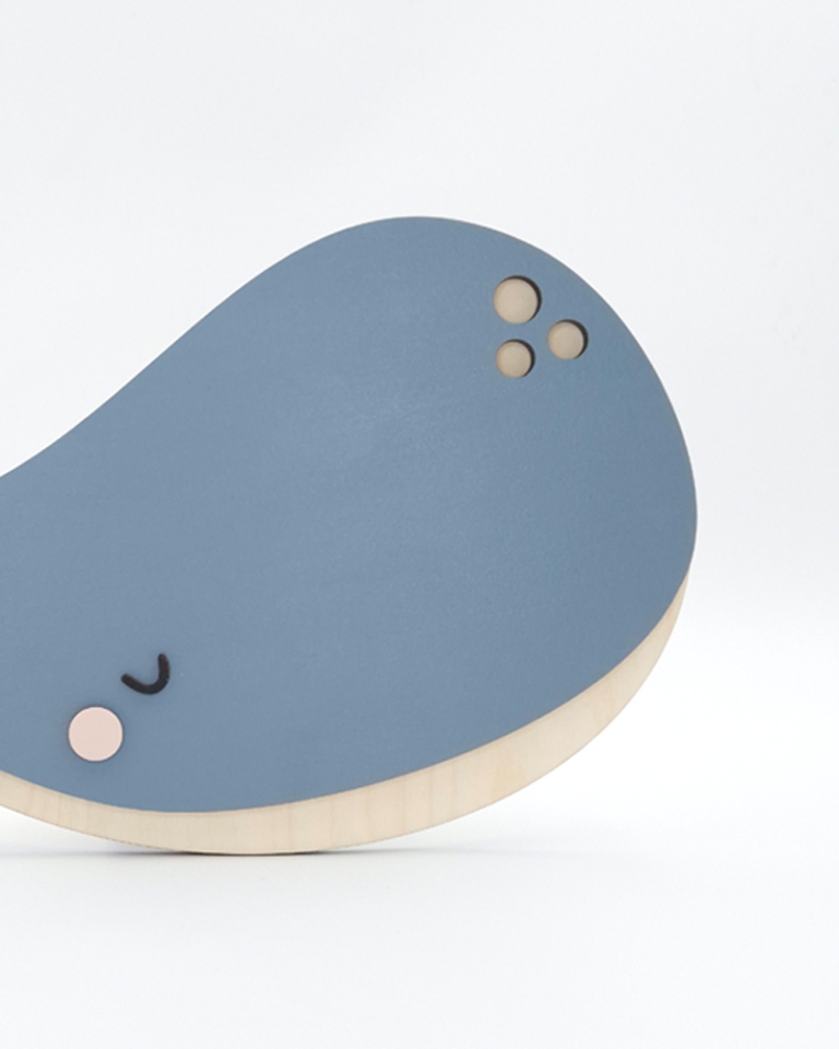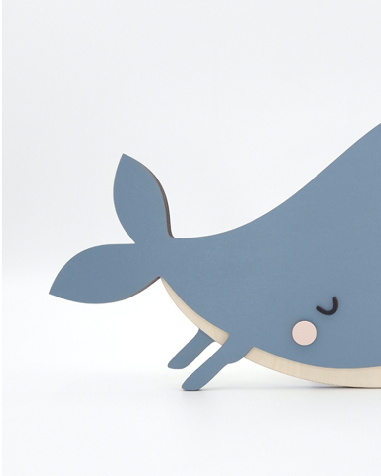Najbardziej charakterystyczną cechą lampki dziecięcej jest wyjątkowo uroczy kształt wieloryba, który utrzymany został w zgaszonym, przyjemnym niebieskim kolorze. Model wykonano z ekologicznej, certyfikowanej sklejki brzozowej, dzięki czemu wyróżnia go zarówno wysoka jakość, jak i bezpieczeństwo użytkowania.