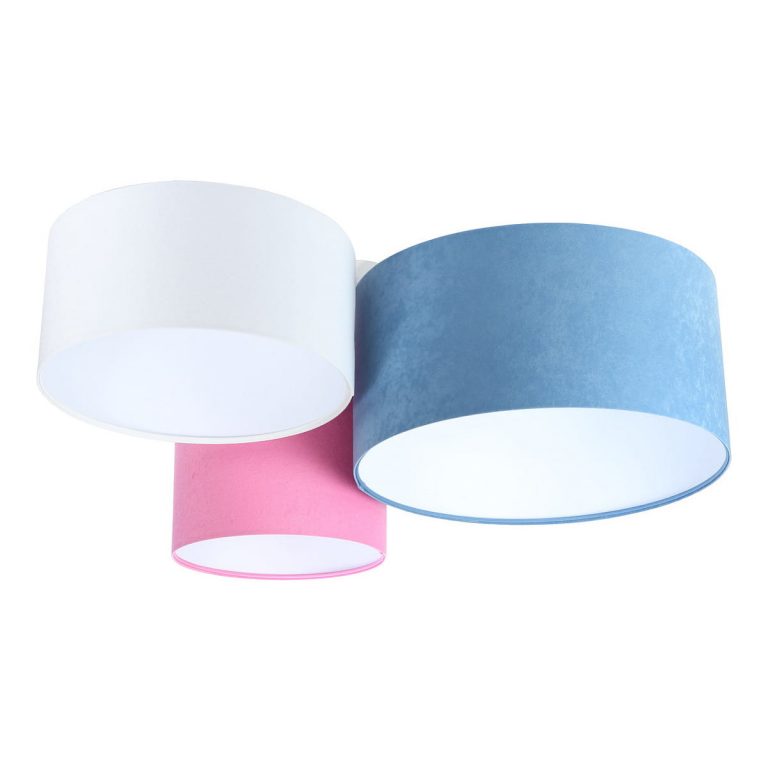 Plafon do pokoju dziecka Tolu Velvet występuje w aż trzech wersjach kolorystycznych. Pierwsza z nich to klosze w kolorze białym różowym i niebieskim. Druga – szarym, różowym i niebieskim. A trzecia – szarym, różowym i bordowym. W zależności od kolorystyki, jaka panuje w pokoju Twojego dziecka, dopasować możesz jedną z tych opcji.