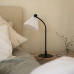 Elegancka lampa stołowa Mira wyposażona jest w nietypowy, plisowany abażur w białym kolorze oraz lekko wygięty stelaż – całość prezentuje się nowocześnie i niezwykle stylowo. To propozycja, która idealnie sprawdzi się w sypialni, tworząc wyjątkowo przytulną atmosferę na czas wieczornego relaksu.