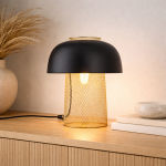 Klosz oferowanej lampy w eleganckim stylu składa się z drucianej złotej części, którą okala czarna kopuła. Tego typu podwójny klosz nadaje całości wyjątkowego charakteru, doskonale wpisując się zarówno w aranżacje nowoczesne, jak i industrialne, czy loftowe. Złote wnętrze klosza ociepla wizualnie wnętrze, a także samą barwę światła.