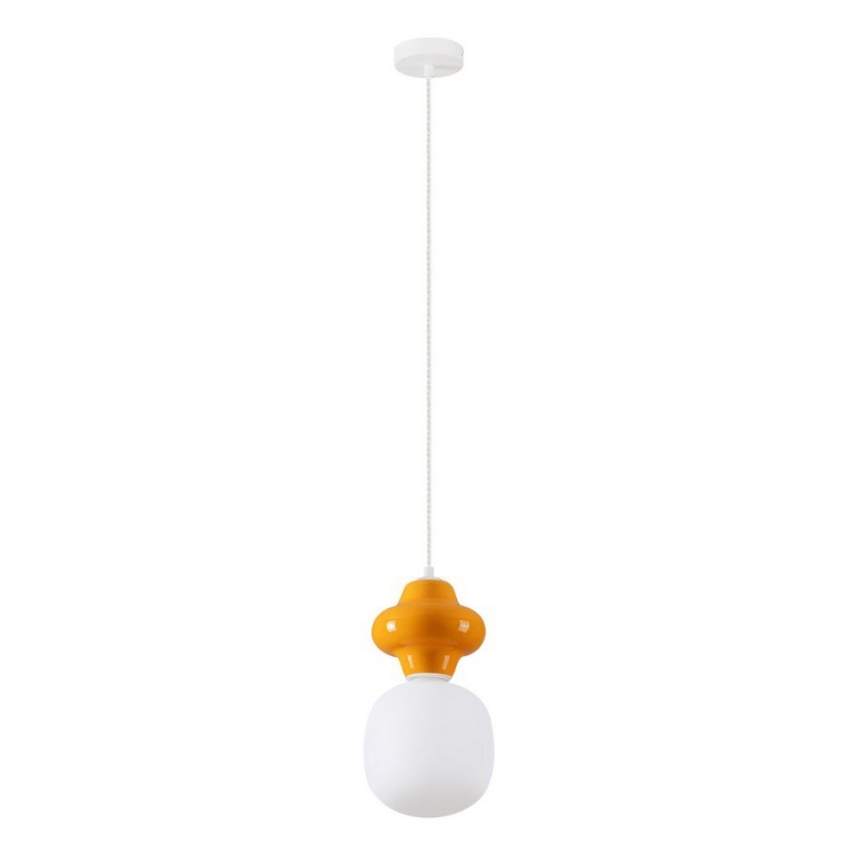Elegancka lampa wisząca Vilrosa A na białej podsufitce wyposażona jest w ceramiczny pomarańczowy element, który wnosi do wnętrza dobrą energię, przytulną atmosferę i doskonale pasuje do współczesnych aranżacji! Kontrastem jest wprowadzona biel, która nadaje oprawie lekkości.