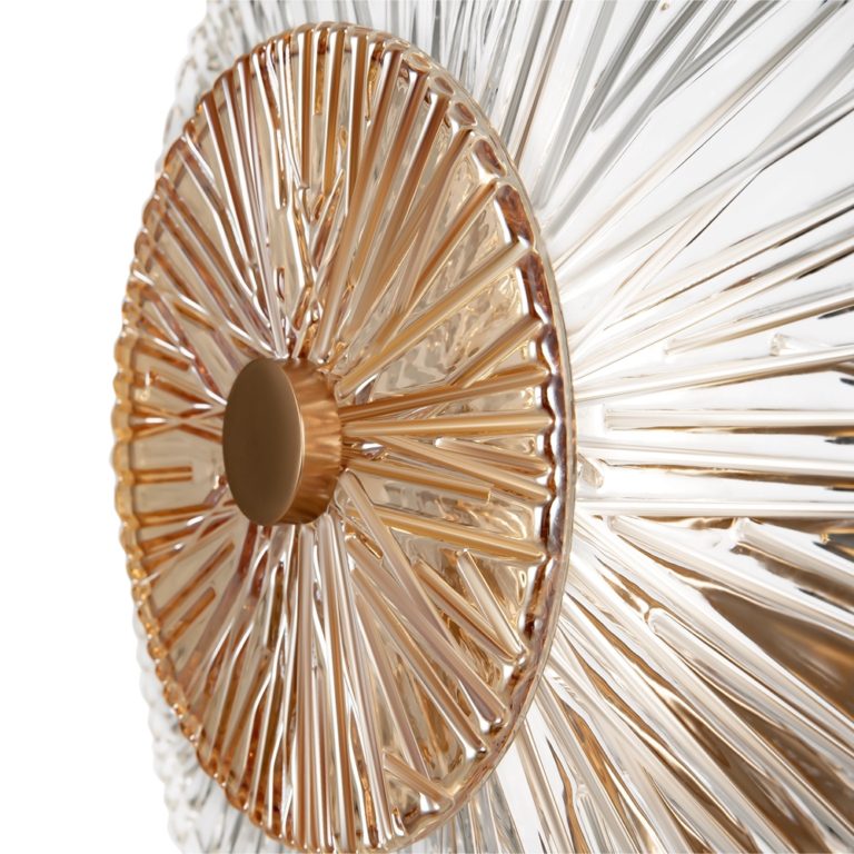 Elegancki kinkiet ścienny Aster w złotym kolorze zwraca na siebie uwagę przede wszystkim niezwykle dekoracyjnym kloszem, który swoim wyglądem nawiązuje do wyglądu kwiatu. Klosz oferowanej lampy ściennej ma okrągły kształt i wykonany jest ze zdobionego szkła w transparentnym oraz miodowym kolorze.