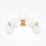 Ta dekoracyjna lampa nowoczesna od razu przyciąga do siebie uwagę designerskim wyglądem oraz ponadczasową kolorystyką. Elegancki kinkiet ścienny Dallas 5 na złotym stelażu wyposażony jest w pięć szklanych mlecznobiałych kloszy w kształcie kuli, z których każdy przystosowany jest do jednej żarówki.