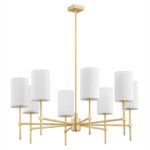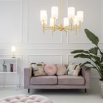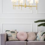Jednym z największych atutów oferowanej lampy sufitowej do salonu Abruzzo 8 jest jej niezwykle elegancka i klasyczna kolorystyka. Metalowy stelaż ma przepiękny mosiężny odcień, natomiast welurowe klosze są białe. Taki dobór barw sprawia, że wnętrze nabiera lekkości i wyrafinowania, a także rozjaśnia wnętrze, nawet w ciągu dnia. Dodatkową zaletą jest również uniwersalność obu tych kolorów. Elegancki żyrandol ze złotym stelażem Abruzzo 8 świetnie prezentuje się we wnętrzach, w których dominuje biel i do których dopasujesz także kilka innych dodatków z mosiężnym odcieniu.