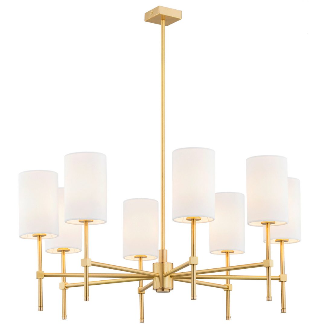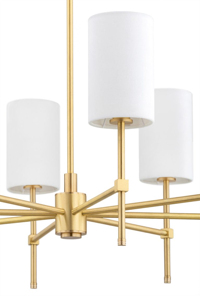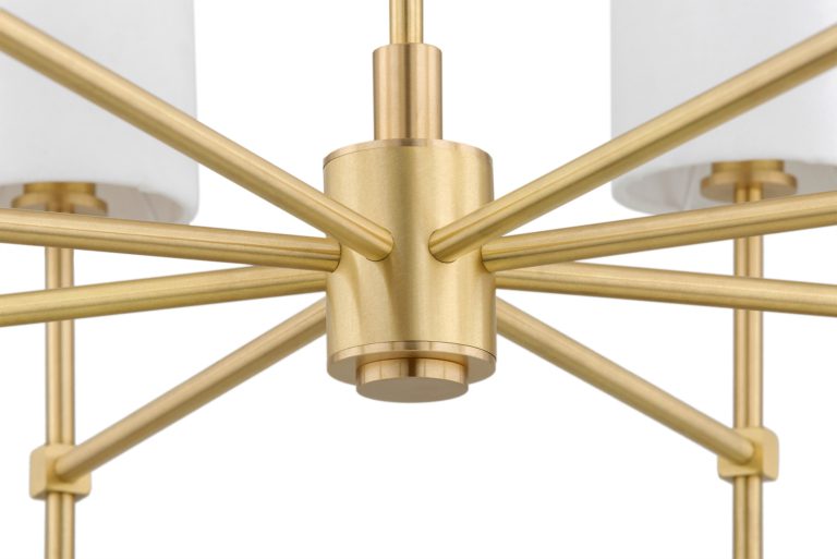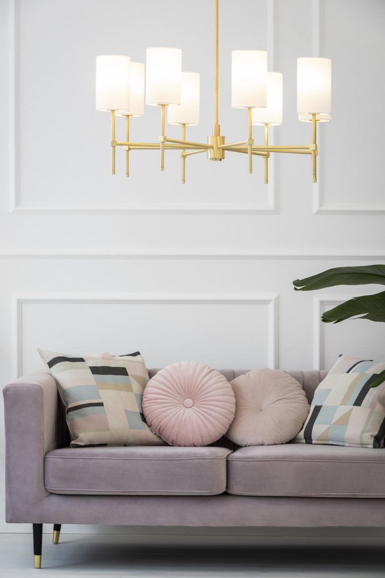 Jednym z największych atutów oferowanej lampy sufitowej do salonu Abruzzo 8 jest jej niezwykle elegancka i klasyczna kolorystyka. Metalowy stelaż ma przepiękny mosiężny odcień, natomiast welurowe klosze są białe. Taki dobór barw sprawia, że wnętrze nabiera lekkości i wyrafinowania, a także rozjaśnia wnętrze, nawet w ciągu dnia. Dodatkową zaletą jest również uniwersalność obu tych kolorów. Elegancki żyrandol ze złotym stelażem Abruzzo 8 świetnie prezentuje się we wnętrzach, w których dominuje biel i do których dopasujesz także kilka innych dodatków z mosiężnym odcieniu.