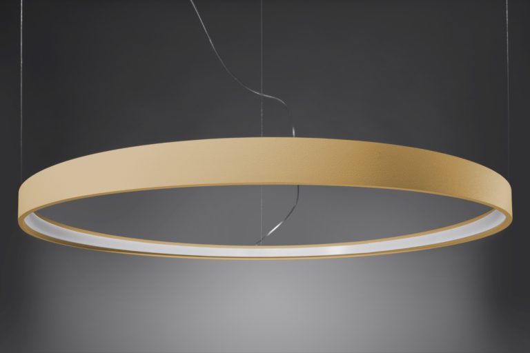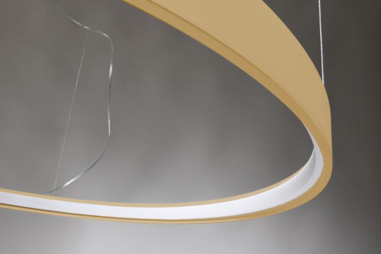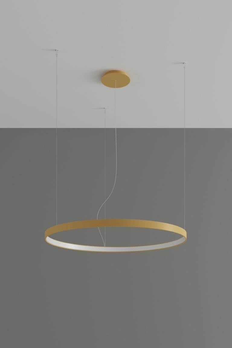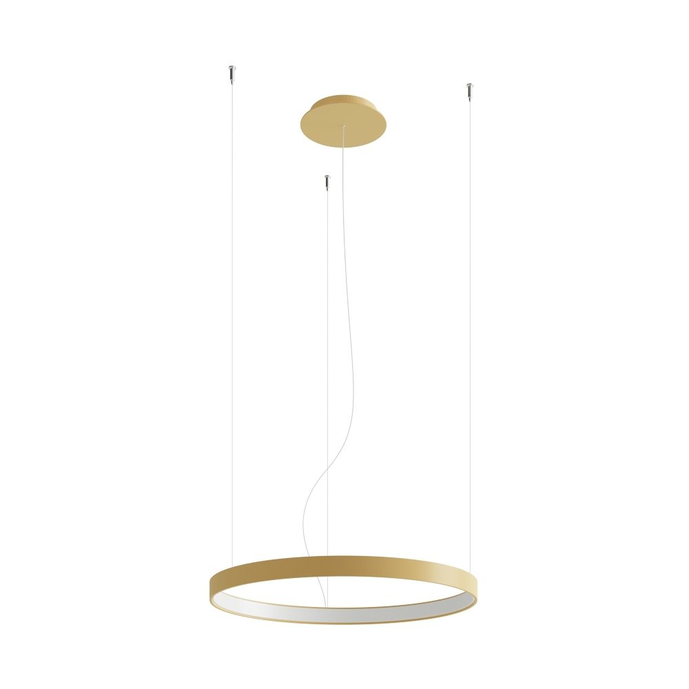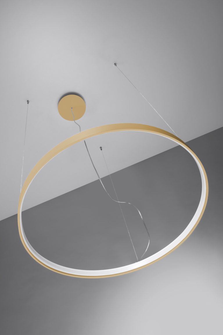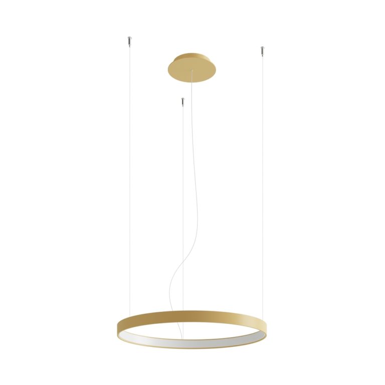 Elegancki żyrandol LED Rio do salonu w całości utrzymany jest w złotej kolorystyce o matowym wykończeniu. Model emituje przyjemne dla oka światło w dwóch wariantach: 3000 i 4000 K. Lampa wisząca złota LED Rio najlepiej prezentuje się w nowoczesnych aranżacjach, w których pojawią się również inne elementy wyposażenia w tej samej kolorystyce. Klasyczny złoty kolor zestawić możesz także z praktycznie każdą inną barwą. Złoty żyrandol pięknie współgra, chociażby z bielą, czernią, granatem i turkusem.