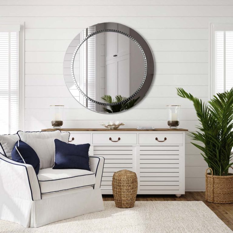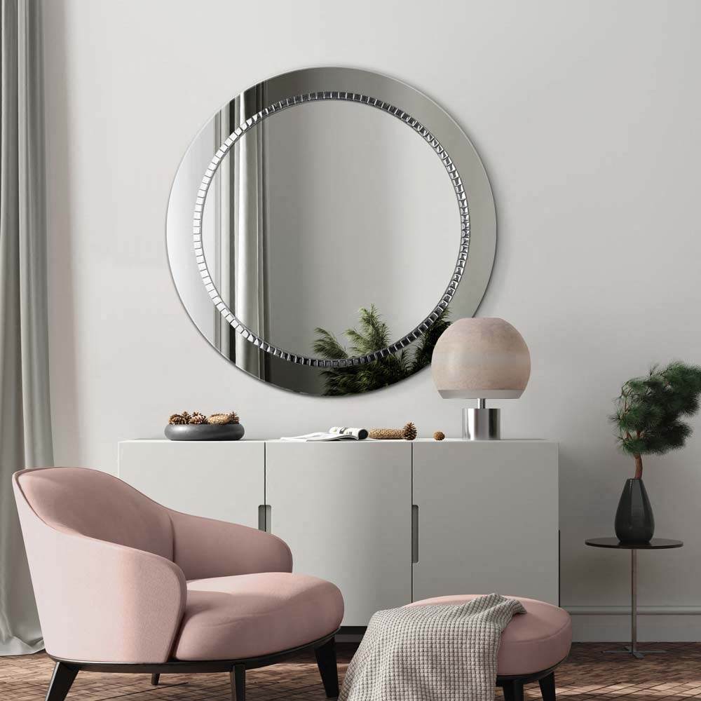 Oferowane lustro do salonu przystosowane jest do zamontowania na ścianie; ułatwią Ci do dwa wieszaki znajdujące się w tylnej części zwierciadła. Eleganckie lustro Bracelet do salonu wyróżnia się również klasycznym okrągłym kształtem. Model ma 70 cm średnicy, ale dostępny jest w naszej ofercie także w innych rozmiarach. Jedną z największych zalet tej propozycji jest też możliwość wykorzystania jej jako lustra łazienkowego. Umożliwiają to wysokiej jakości, wodoodporne materiały.