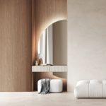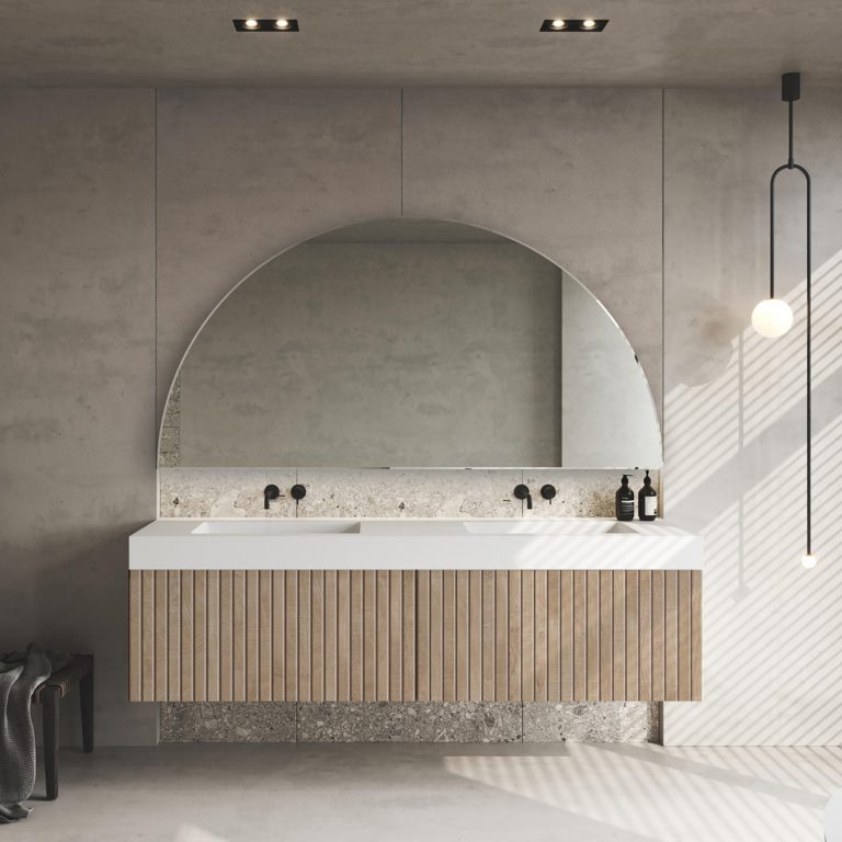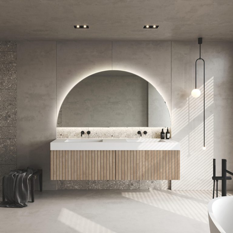 Wodoodporne lustro w półokrągłym kształcie Dimidium pozbawione jest klasycznej ramy, co jeszcze bardziej podkreśla jego nowoczesny charakter. Prezentowane zwierciadło ścienne dostępne jest w naszym sklepie online w wielu rozmiarach do wyboru, dlatego z łatwością dopasujesz je do swojego wnętrza. Ponadto możesz zdecydować się także na wariant wyposażony w podświetlenie ledowe, które ułatwi Ci wykonywanie codziennej pielęgnacji. Eleganckie lustro Dimidium w nowoczesnym stylu może stać się również ciekawym urozmaiceniem Twojej sypialni, salonu lub garderoby.
