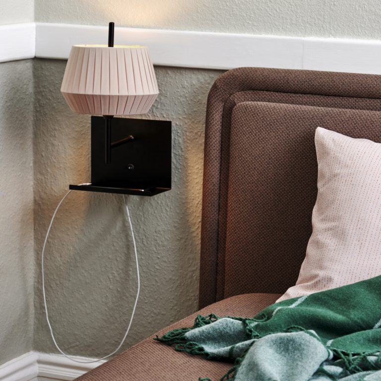 To propozycja oświetlenia na ścianę do sypialni, która doskonale sprawdza się także w innych wnętrzach – na przykład jako uzupełnienie wyposażenia biura, salonu, czy przedpokoju. Funkcjonalny kinkiet ścienny Dicte z półką składa się z dwóch głównych elementów: metalowego stelaża z podstawą (która pełni rolę podręcznej półeczki) oraz bawełnianego klosza z plisami. Oferowana lampa kinkietowa wyposażona jest również w port USB do ładowania smartfona i innych elektronicznych urządzeń.