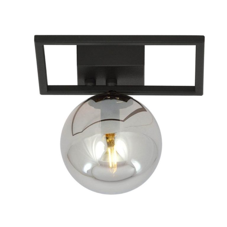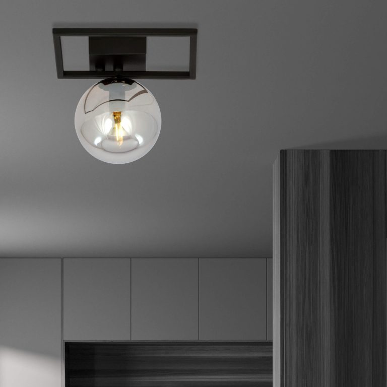 Geometryczna lampa sufitowa do przedpokoju Sole Oblong S składa się z prostokątnego stelaża, wykonanego ze stali lakierowanej na czarno oraz z kulistego klosza. Do jego stworzenia wykorzystano szkło o niestandardowej, popielatej barwie. Oba elementy tworzą wyjątkowo zgraną całość, która prezentuje się oryginalnie, ale też bardzo gustownie. Dodatkowo popielate szkło sprawia, że światło staje się nieco bardziej nastrojowe.