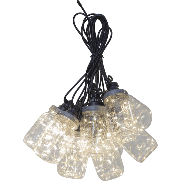 Lampki ogrodowe zamontowane są na długim przewodzie w odstępie 50 cm od siebie. Diody emitują przyjemne światło o ciepłej temperaturze barwowej, a ich żywotność wynosi 7000 h. Sam kabel zasilający ma 500 cm długości, dlatego z łatwością podłączysz go do najbliższego kontaktu. Girlanda świetlna z kloszami w kształcie słoi na 10 lampek to energooszczędny i nowoczesny sposób na podświetlenie wybranej przestrzeni.