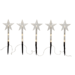 Oferowana dekoracja świąteczna składa się z pięciu pięcioramiennych gwiazdek z diodami LED, które emitują przyjemne światło. Gwiazdki ogrodowe Wanda połączone są ze sobą przewodem i przystosowane do trzech baterii AA. Dodatkowo gwiazdki LED posiadają praktyczne stelaże do wbicia w grunt. Całość ma 140 cm szerokości 25 cm wysokości.