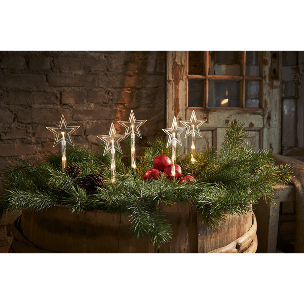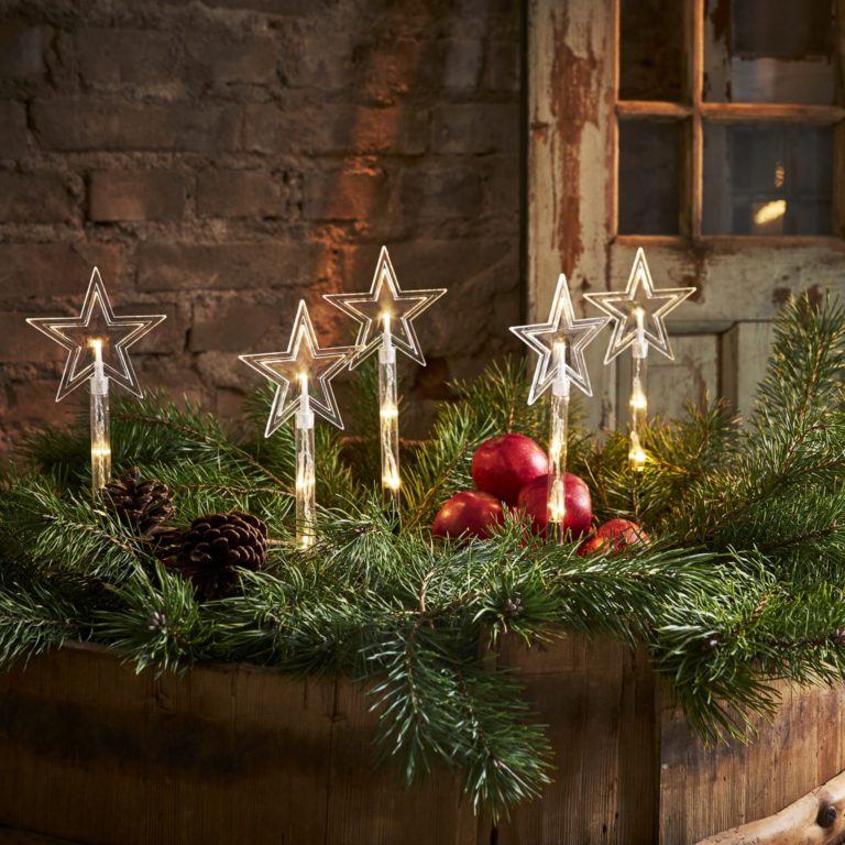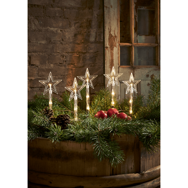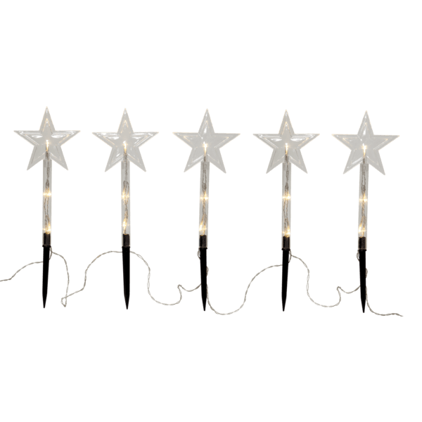 Oferowana dekoracja świąteczna składa się z pięciu pięcioramiennych gwiazdek z diodami LED, które emitują przyjemne światło. Gwiazdki ogrodowe Wanda połączone są ze sobą przewodem i przystosowane do trzech baterii AA. Dodatkowo gwiazdki LED posiadają praktyczne stelaże do wbicia w grunt. Całość ma 140 cm szerokości 25 cm wysokości.