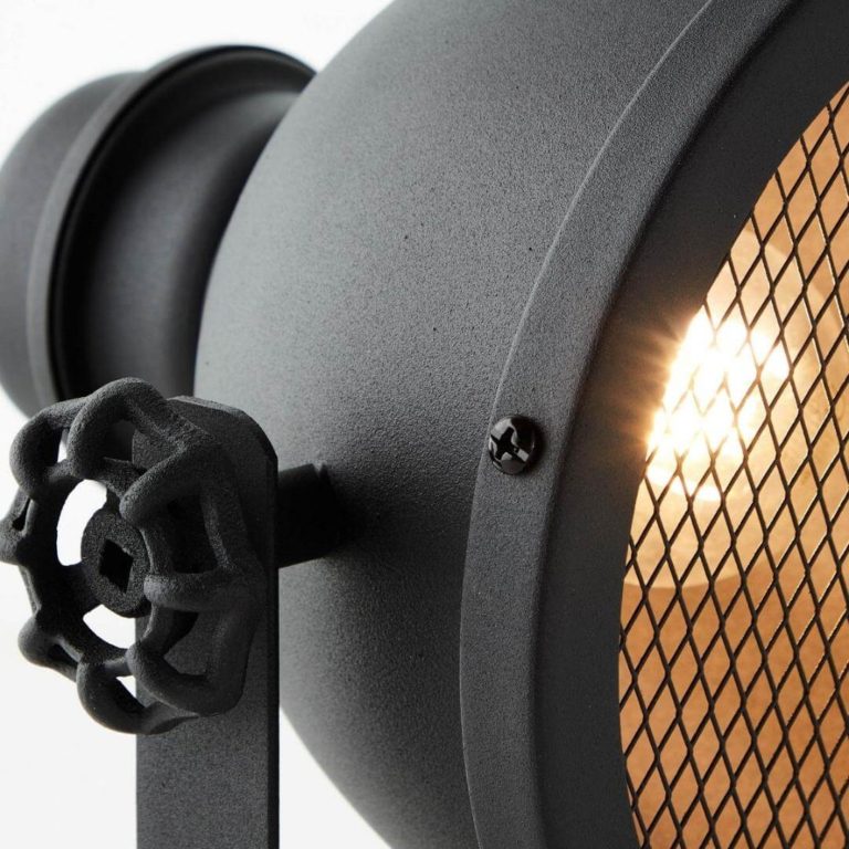 Lampa stołowa do salonu w industrialnym stylu Kiki wykonana jest w całości z metalu w odcieniu czarnego korundu. Model składa się z oryginalnego klosza, wyposażonego w osłonę z drucianej siateczki oraz z podwójnej podstawy w formie charakterystycznych nóżek. Lampka w kształcie reflektora Kiki ozdobiona jest detalami, nadającymi jej jeszcze bardziej efektownego wyglądu – w tym imitacją pokrętła umieszczoną z boku klosza.
