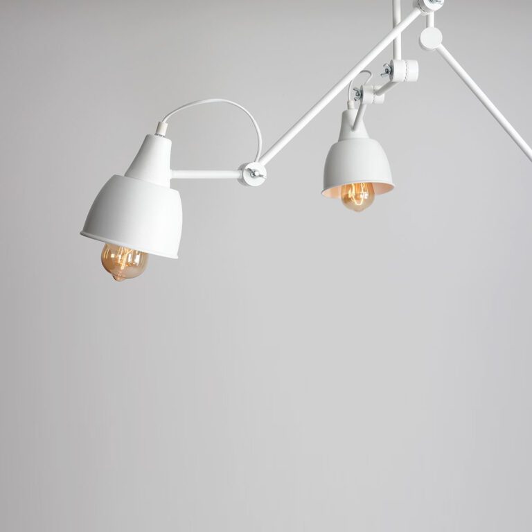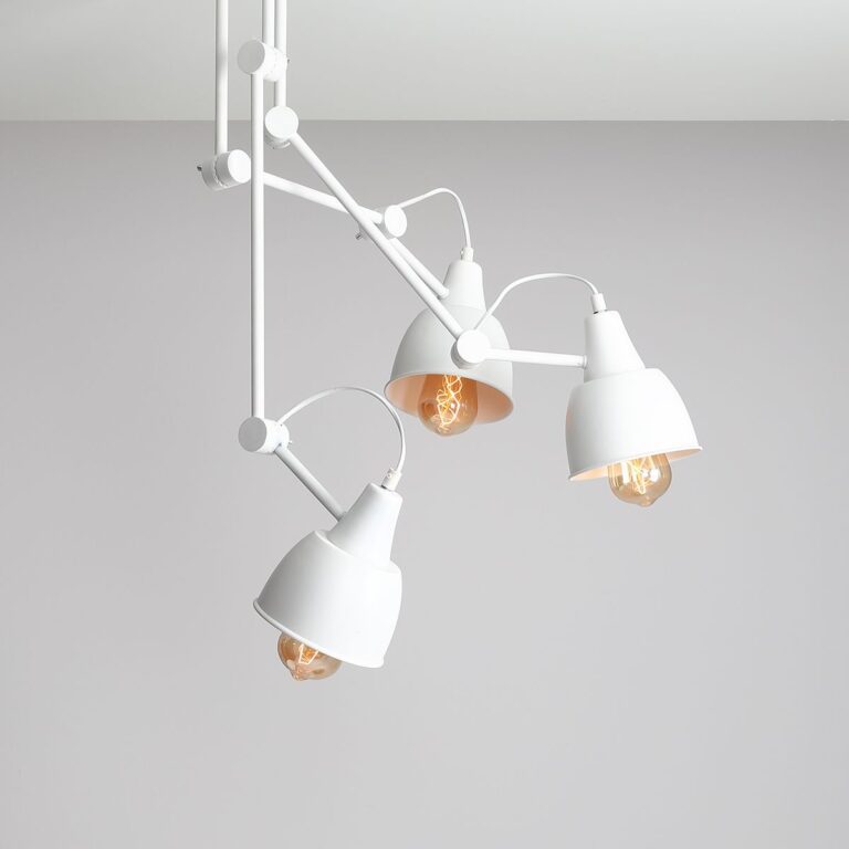 Biały żyrandol z kloszami funkcjonalnie oświetli całe pomieszczenie, a z racji regulacji kąta padania światła, także jego fragmenty. Pięknie wkomponuje się w nowoczesny salon z jasnymi meblami oraz z surowymi lub kontrastowymi dodatkami. Polubi też kwiaty i soczystą zieleń. Sprawdzi się również jako sufitowa lampa do gabinetu.