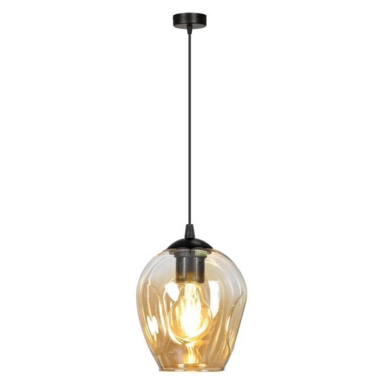 Lampa wisząca Ava składa się wyłącznie z podsufitki, przewodu oraz klosza. Minimalistyczny design doskonale współgra tutaj z kolorystyką – czarny stelaż z metalu przepięknie podkreśla miodowy klosz. Ten z kolei wykonany jest z wysokiej jakości szkła, wysokość bryły wynosi 17 cm. W najszerszym miejscu klosz ma 14 cm, natomiast sama podsufitka jedynie 8 cm.