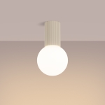 Jasnobeżowy plafon sufitowy na ryflowanej stopce Globia IP44 wyposażony jest w klosz w modnym kształcie idealnej kuli, która utrzymana jest w mlecznobiałym odcieniu. Zarówno forma, jak i kolorystyka klosza sprawia, że wnętrze wypełnia się miękko rozproszonym światłem, które doskonale sprawdza się na co dzień. Ryflowana stopka z aluminium stanowi ozdobny akcent, który jednak nie dominuje całości.