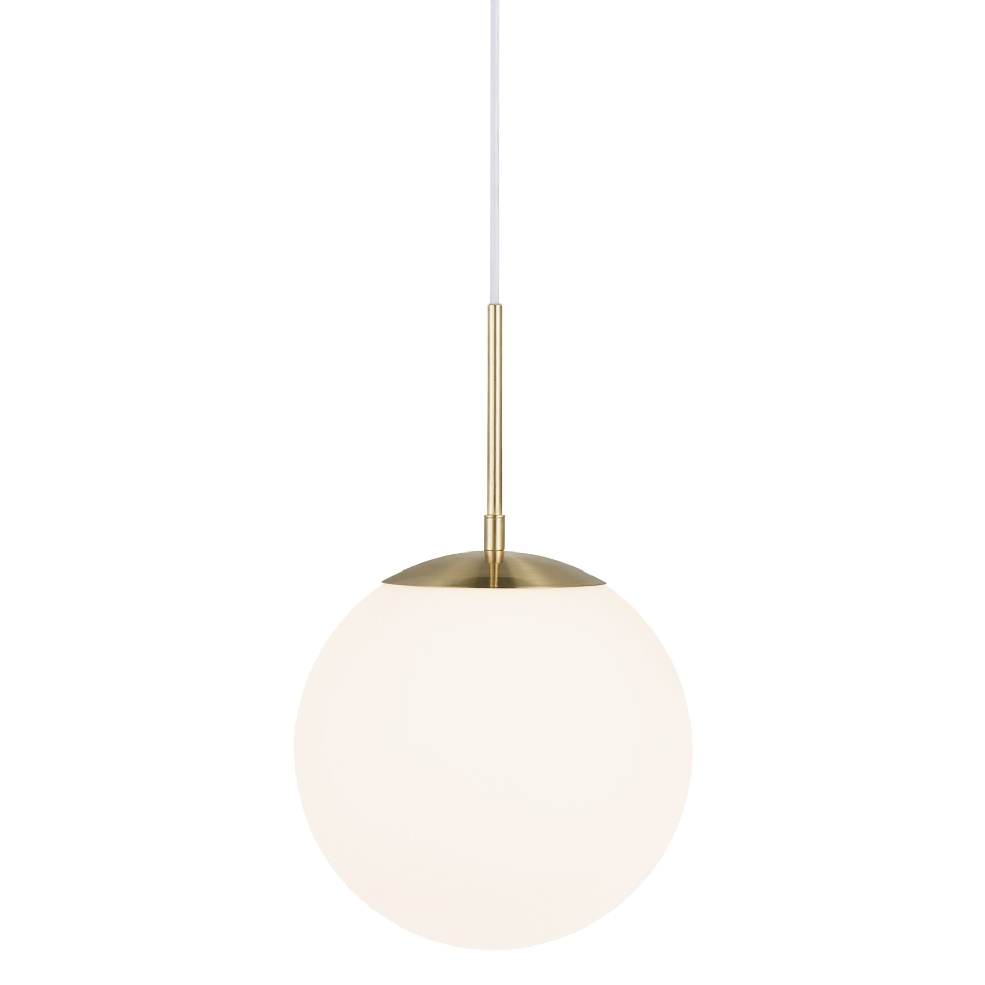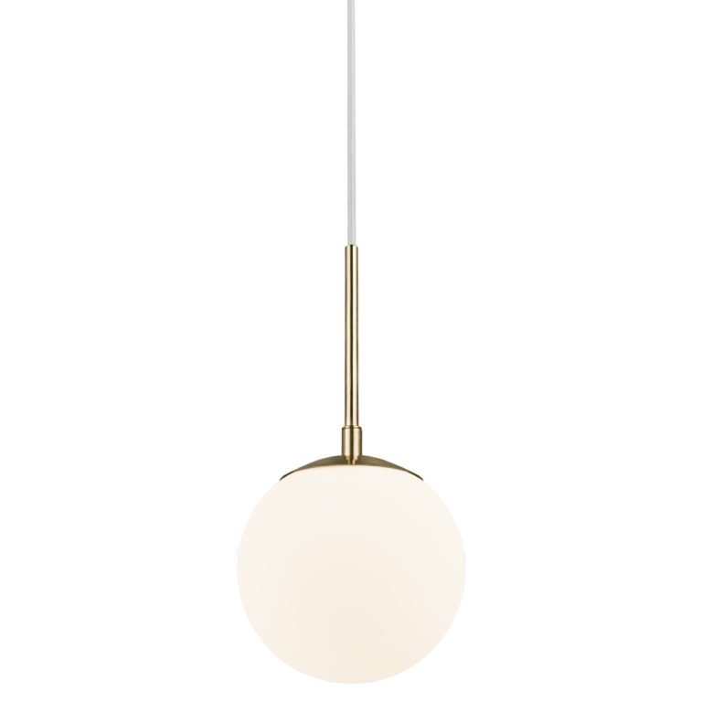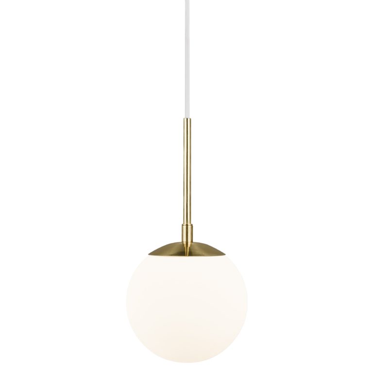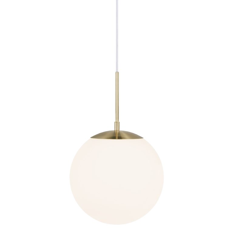 Pojedyncza lampa wisząca Grant wyposażona jest w klosz w kształcie idealnej kuli, który wykonany został z mlecznobiałego szkła. Zarówno forma, jak i zastosowana kolorystyka umożliwiają równomierne i łagodnie rozproszone światło, które sprzyja budowaniu przyjaznej atmosfery. Biały klosz idealnie komponuje się ze złotymi elementami, nadając oprawie wyrafinowanego charakteru. Jednopunktowa lampa wisząca na złotym stelażu Grant to propozycja, która doskonale prezentuje się w aranżacjach nowoczesnych, także inspirowanym stylem klasycznym i glamour.