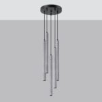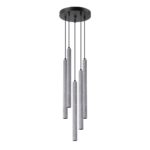 Najbardziej charakterystyczną cechą kaskadowej lampy wiszącej Callum 5 na czarnym stelażu jest jej designerski wygląd, który idealnie wpisuje się w modę na nowoczesne chłodne wnętrza, w których dominuje minimalizm. Oferowana lampa kaskadowa wyposażona jest płaską okrągłą podsufitkę oraz pięć zwisów z kloszami w kształcie wąskiej tuby. Wszystkie klosze wykonane zostały z betonu. Lampa nowoczesna Callum 5 posiada regulowane przewody oraz przystosowana jest do energooszczędnych żarówek LED.