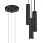 Kaskadowa lampa wisząca Dolkar 3 w czarnym kolorze wykonana została z wysokiej jakości metalu, charakteryzuje się trwałością i minimalistycznym designem. Polecana lampa w nowoczesnym stylu składa się z trzech kloszy w formie tuby oraz okrągłej podsufitki, która łączy ze sobą wszystkie elementy.