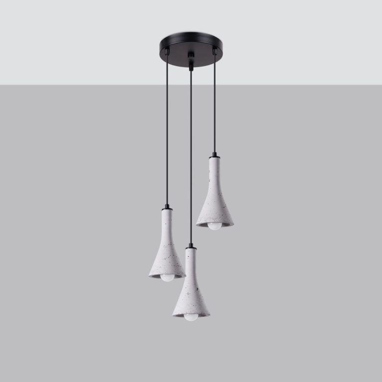Kaskadowa lampa wisząca Reece 3 na okrągłej podsufitce doskonale pasuje do chłodnych nowoczesnych aranżacji, w których dominuje minimalizm. Jeśli chcesz nadać przestrzeni bardziej przytulnego klimatu, zestaw lampę betonową Reece 3 z naturalnym drewnem – na przykład pod postacią mebli.