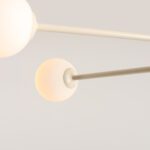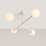 Kremowa lampa sufitowa z mlecznobiałymi kloszami Dot 4 wyróżnia się minimalistycznym designem: model składa się z prostego metalowego stelaża oraz czterech kulistych kloszy ze szkła. Wyjątkowo nowoczesna lampa sufitowa Dot 4 ma 87 cm szerokości, głębokość 56 cm, wysokość 38 cm oraz klosze o średnicy 14 cm, które doskonale rozpraszają światło.