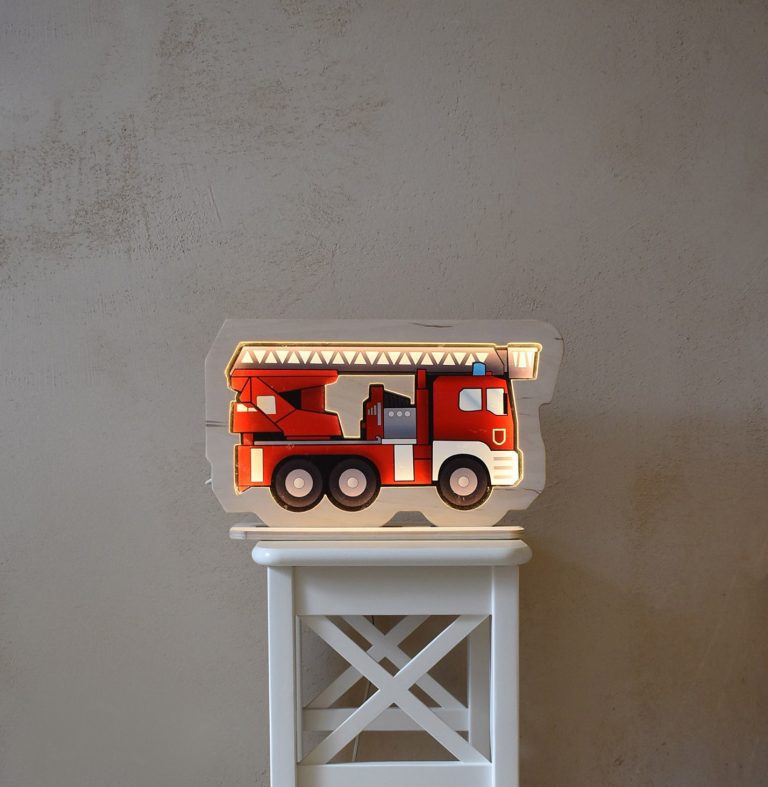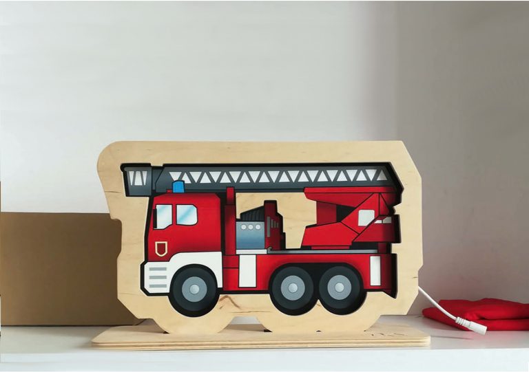 Z pewnością taka właśnie jest czerwona lampka Wóz Strażacki. Wykonano ją ze sklejki brzozowej, jest to ekologiczny i bezpieczny dla środowiska materiał, pokryty farbami wodnymi. Łączy w sobie naturalny kolor drewna z czerwienią i czarnymi elementami.