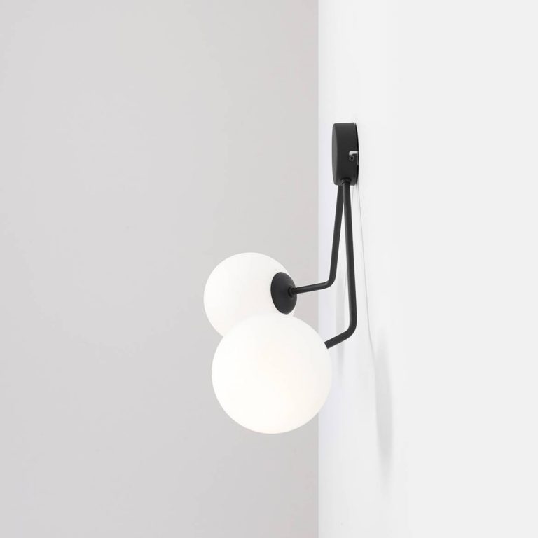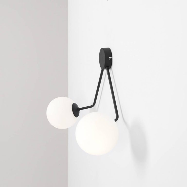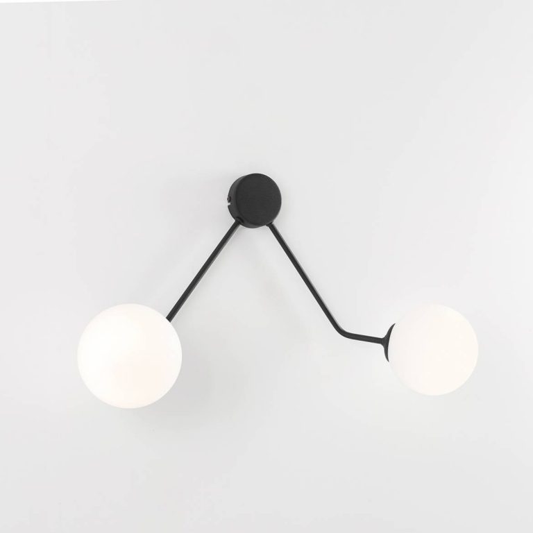 Oferowany przez nasz sklep internetowy kinkiet składa się z podwójnego, metalowego stelaża w kolorze czarnym. Przytwierdzono do niego dwa kuliste klosze wykonane z mlecznobiałego szkła. Całość wygląda niezwykle nowocześnie i doskonale będzie się prezentować jako oświetlenie dodatkowe, między innymi, w minimalistycznych wnętrzach.