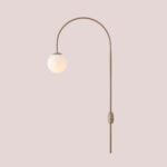 Oprawa składa się jedynie z dwóch głównych elementów, które doskonale ze sobą współgrają: stelaża w charakterystycznym kształcie łuku oraz klosza o modnej aktualnie formie kuli. Geometryczność zestawiona została tutaj z delikatną, jasną kolorystyką. Pod względem estetycznym, lampa ścienna znakomicie odnajduje się w neutralnych aranżacjach, dla których bazą będzie beż i biel, podkreślona na przykład brązami. Z łatwością wkomponujesz ją nie tylko we wnętrza nowoczesne, ale również utrzymane w stylu soft minimalism, czy skandynawskim.