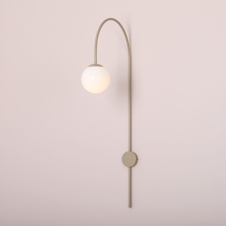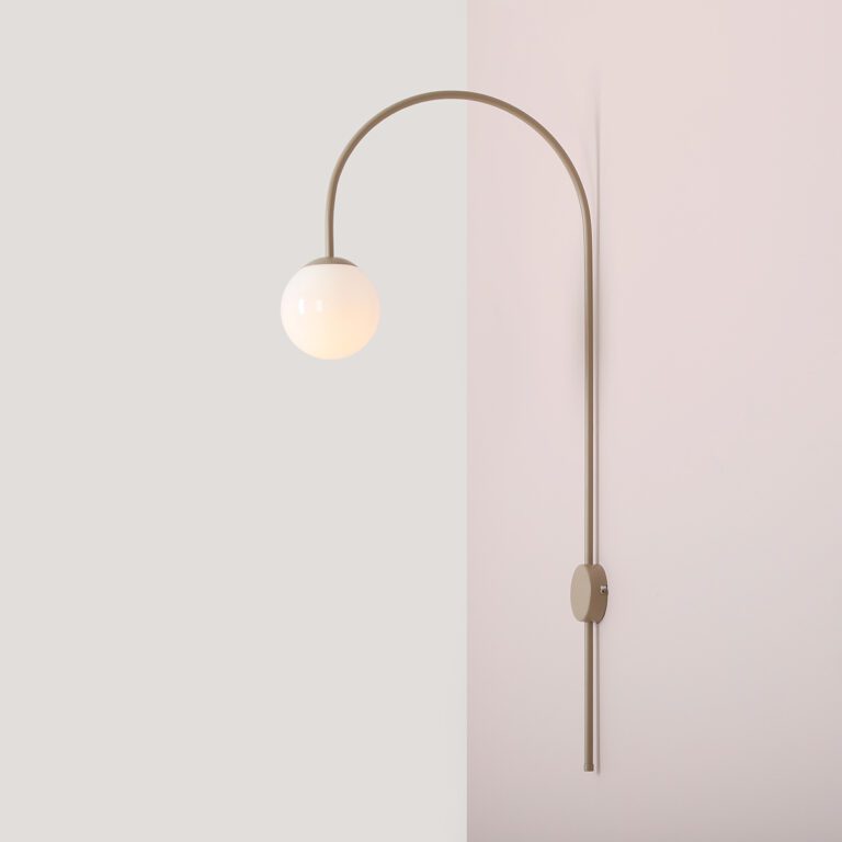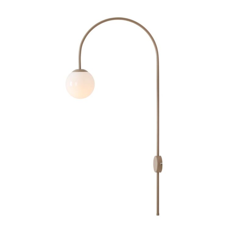 Oprawa składa się jedynie z dwóch głównych elementów, które doskonale ze sobą współgrają: stelaża w charakterystycznym kształcie łuku oraz klosza o modnej aktualnie formie kuli. Geometryczność zestawiona została tutaj z delikatną, jasną kolorystyką. Pod względem estetycznym, lampa ścienna znakomicie odnajduje się w neutralnych aranżacjach, dla których bazą będzie beż i biel, podkreślona na przykład brązami. Z łatwością wkomponujesz ją nie tylko we wnętrza nowoczesne, ale również utrzymane w stylu soft minimalism, czy skandynawskim.