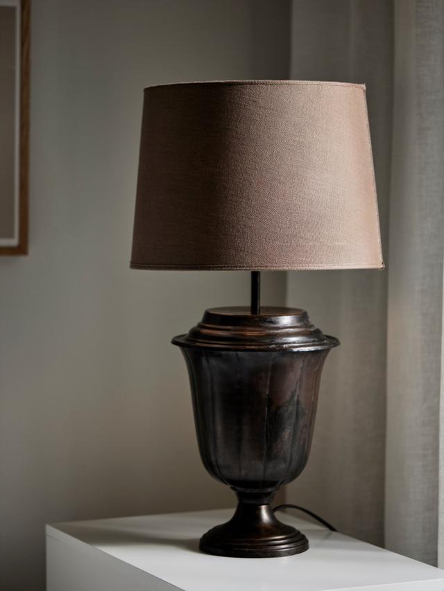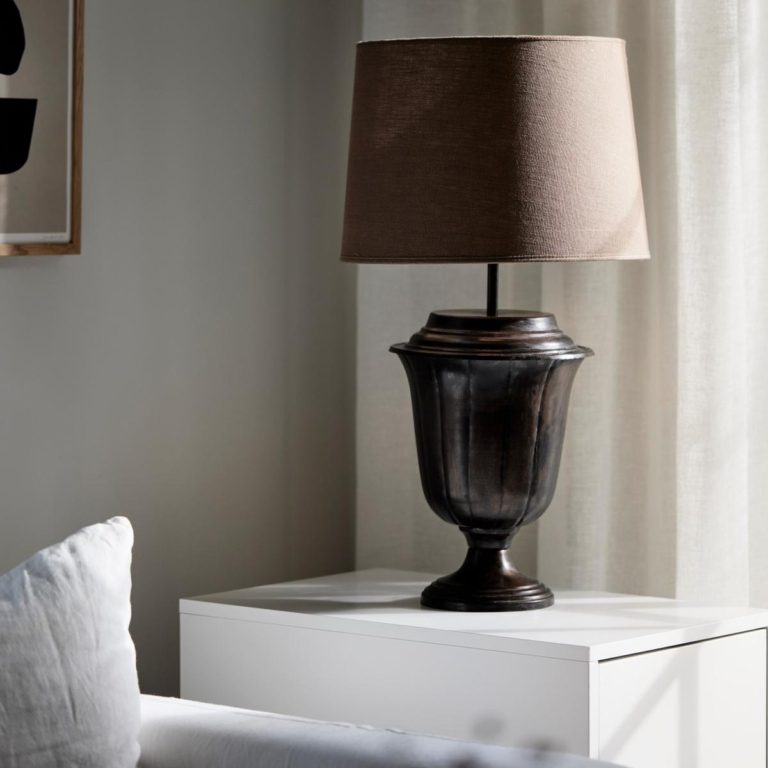 Polecana oprawa doskonale sprawdza się w roli lampki nocnej, którą postawić możesz obok szafki przy łóżku – najlepiej po obu jego stronach, co nada przestrzeni harmonii. Czarna lampa stołowa Elli z postarzaną podstawą wyjątkowo dobrze współgra z antykami oraz meblami w stylu klasycznym. Oferowana lampa na stół wyposażona jest w brązowy tkaninowy klosz, który przyciemnia światło i tym samym ociepla wnętrze.