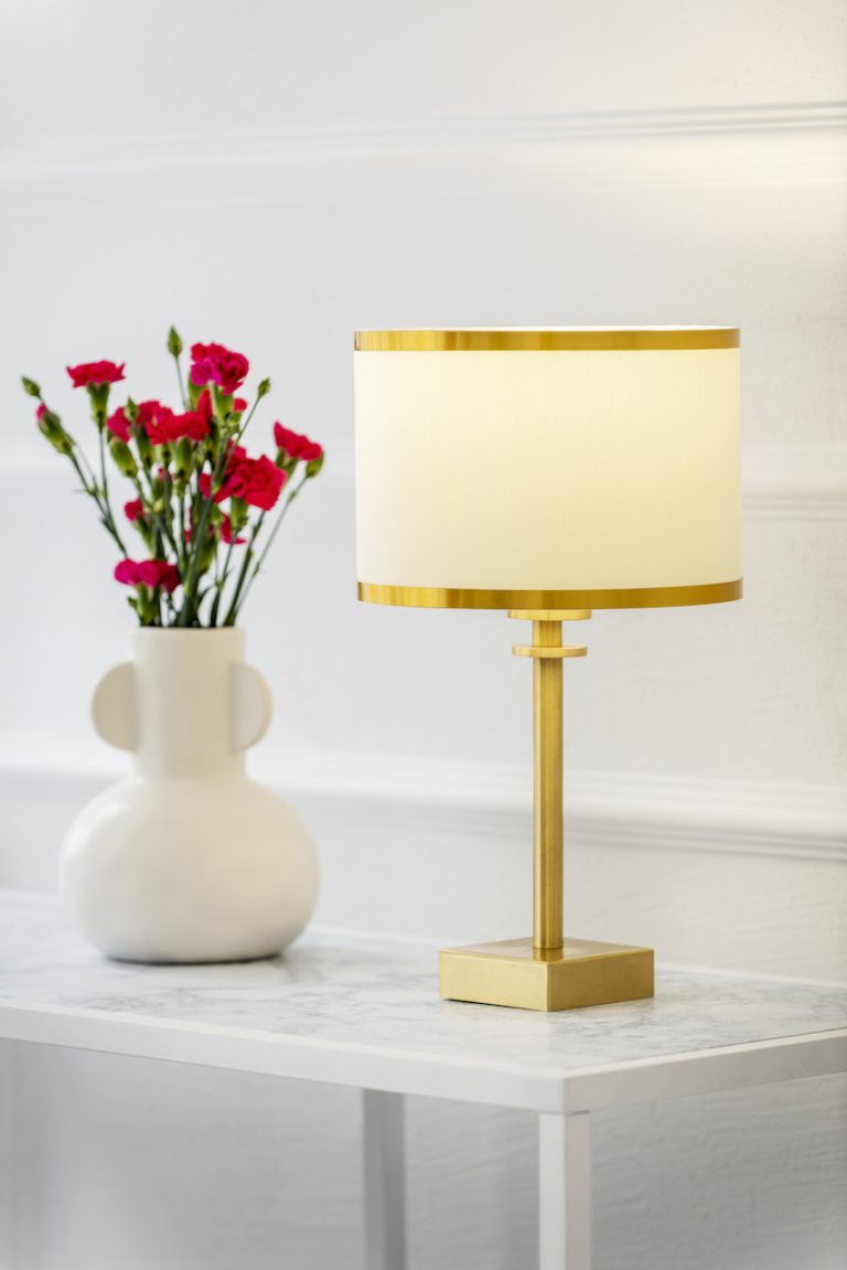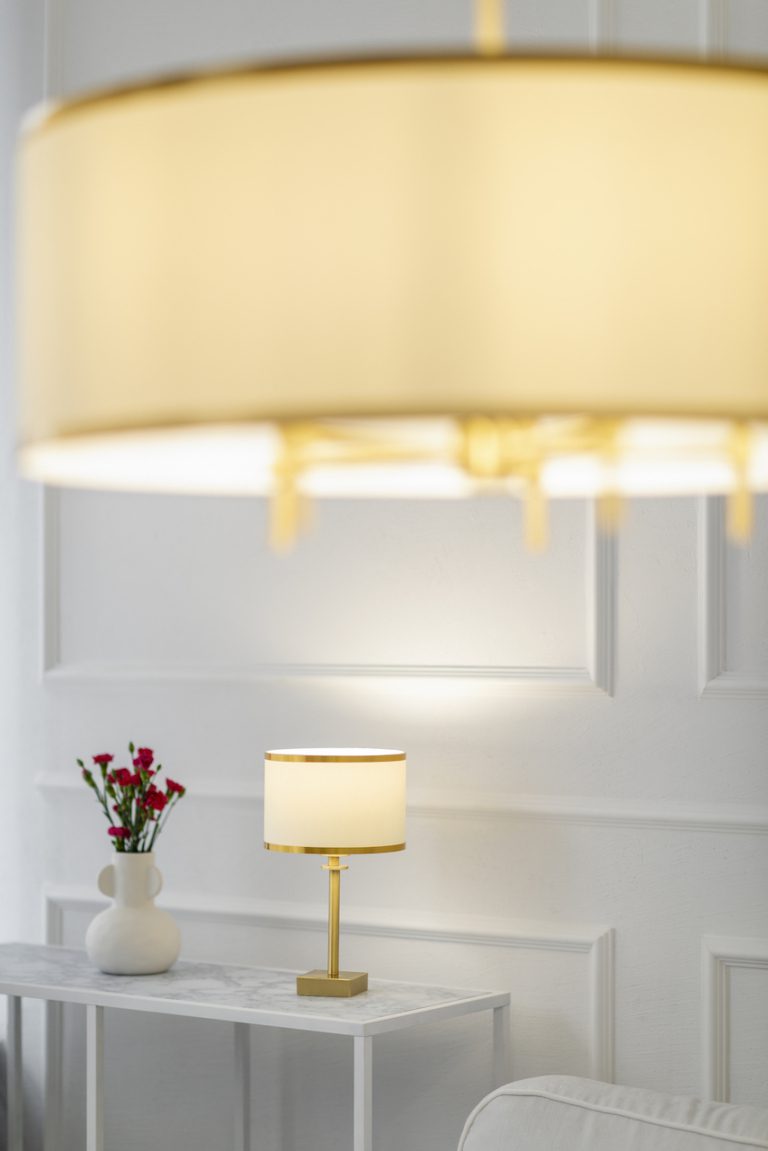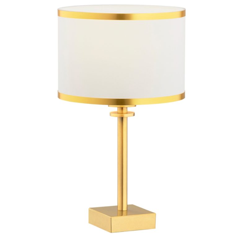 Oferowany model charakteryzuje się uniwersalną wielkością, która sprawdzi się w każdym wnętrzu. Abbando to doskonała lampka na stolik nocny w sypialni, stół w salonie, czy komodę w przedpokoju. Całkowita wysokość oprawy wynosi 38 cm, średnica najszerszego miejsca (czyli abażuru w kształcie cylindra) to 25 cm. Sama podstawa, na której stoi ta złota lampa, ma formę kwadratu o boku 10 cm. Z informacji czysto technicznych warto również wspomnieć o samym oświetleniu. Omawiany model zaprojektowany został z myślą o jednym źródle światła i współpracuje z różnymi żarówkami E27. Z naszej strony rekomendujemy energooszczędne oświetlenie LED o ciepłej lub neutralnej barwie.