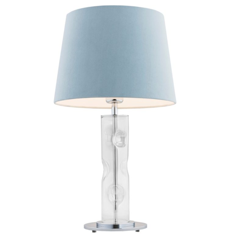Lampa stołowa z transparentną designerską podstawą Nancy odnajdzie się w wielu wnętrzach i w zestawieniu z różnymi trendami. Wyjątkowo dobrze prezentuje się na tle aranżacji nowoczesnych, eklektycznych oraz glamour. Błękitny kolor klosza wnosi do wnętrza łagodność i spokój. Niebieska lampa stołowa w nowoczesnym stylu Nancy pasuje zarówno do bieli, szarości i beży, jak i do innych pastelowych barw.