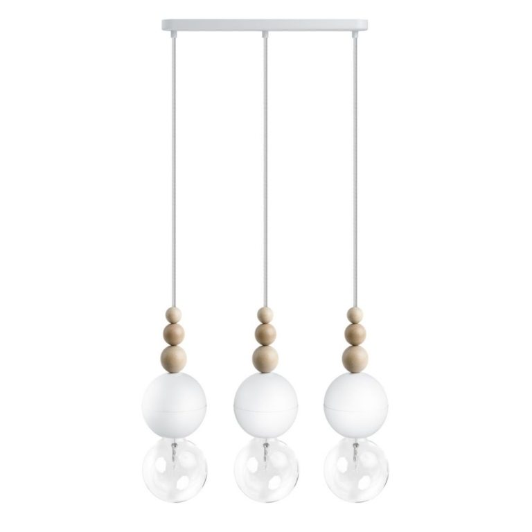 Biały żyrandol z drewnianymi koralikami to świetna lampa nad duży stół lub barek, choć bardzo dobrze radzi sobie także w roli centralnego oświetlenia do salonu. W otoczeniu jasnych mebli, stonowanych dodatków oraz dekoracyjnych akcentów inspirowanych naturą, ta potrójna lampa wisząca prezentować się będzie wspaniale!