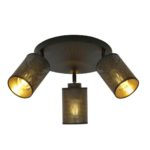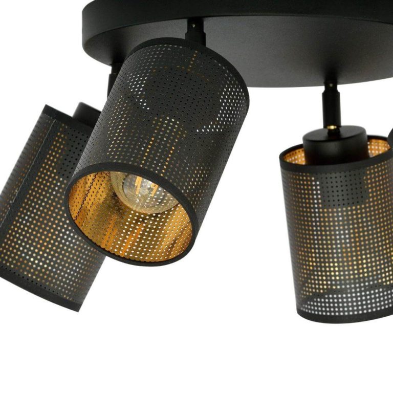 Lampa sufitowa z reflektorami Ring 3 niemal w całości jest czarna. Złote są jedynie wnętrza oryginalnych kloszy. Obie te barwy świetnie ze sobą współgrają, dając wyjątkowo elegancki efekt. Za sprawą odrobiny złotego blasku, oferowany model możesz wykorzystać również do nieco bardziej strojnych aranżacji – na przykład łączących styl industrialny z wciąż bardzo popularnym nurtem glamour. Jeszcze więcej charakteru wydobędziesz z oświetlenia na sufit Ring 3, umieszczając go w zestawieniu z innymi elementami o tej samej kolorystyce.