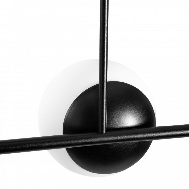 Sufitową lampę Kop D tworzą cztery szklane, mlecznobiałe klosze osadzone na poziomym czarnym stelażu. Zwróć uwagę na ich ciekawe i nieoczywiste zamocowanie! To gustowne połączenie stylu zamknięte w dość zwięzłej i symetrycznej bryle, które idealnie ozdobi wnętrze Twojego nowoczesnego mieszkania.
