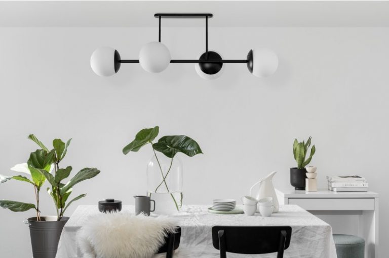 Jasne, ciepłe i miękkie światło, które płynie z dużych białych kloszy (każdy o średnicy aż 20 cm) równomiernie rozkłada się na wszystkie strony, zatem najlepiej żyrandol ten zamocować na środku pomieszczenia: salonu, pokoju dziennego czy nawet sypialni. Idealnie sprawdzi się nad stołem jadalnym, gdyż jego szerokość wynosi 120 cm. Posiłki oświetlone salonową lampą Kop D smakować będą wybornie!