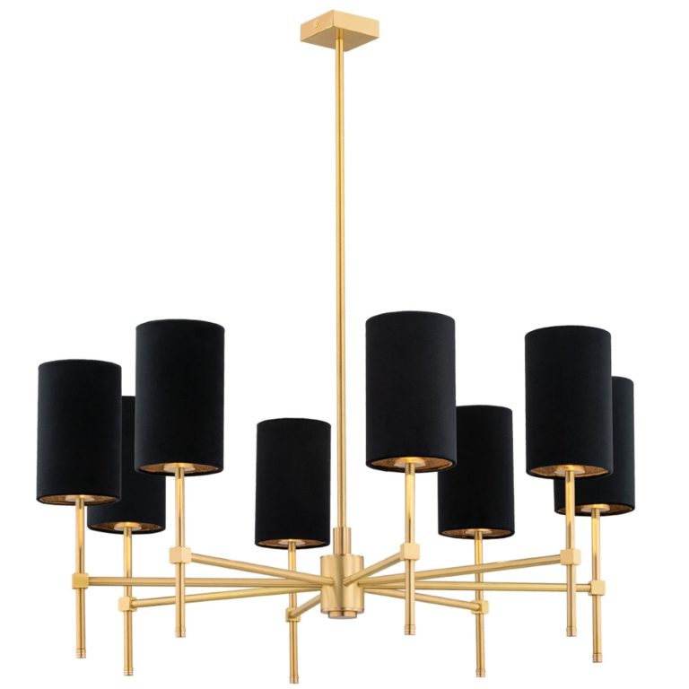 Regulowana lampa sufitowa glamour Abruzzo 8 to stalowy stelaż z ramionami oraz osiem welurowych kloszy w kształcie tuby. Metalowe elementy wyróżniają się połyskującym mosiężnym wykończeniem, który nadaje całości niesamowitego blasku! Wszystkie abażury mają tę samą wielkość i wykonane zostały z tak modnej ostatnio tkaniny welurowej – tutaj w klasycznym czarnym kolorze. Złoty żyrandol z regulacją Abruzzo 8 ma szerokość 86 cm i wysokość 91 cm.
