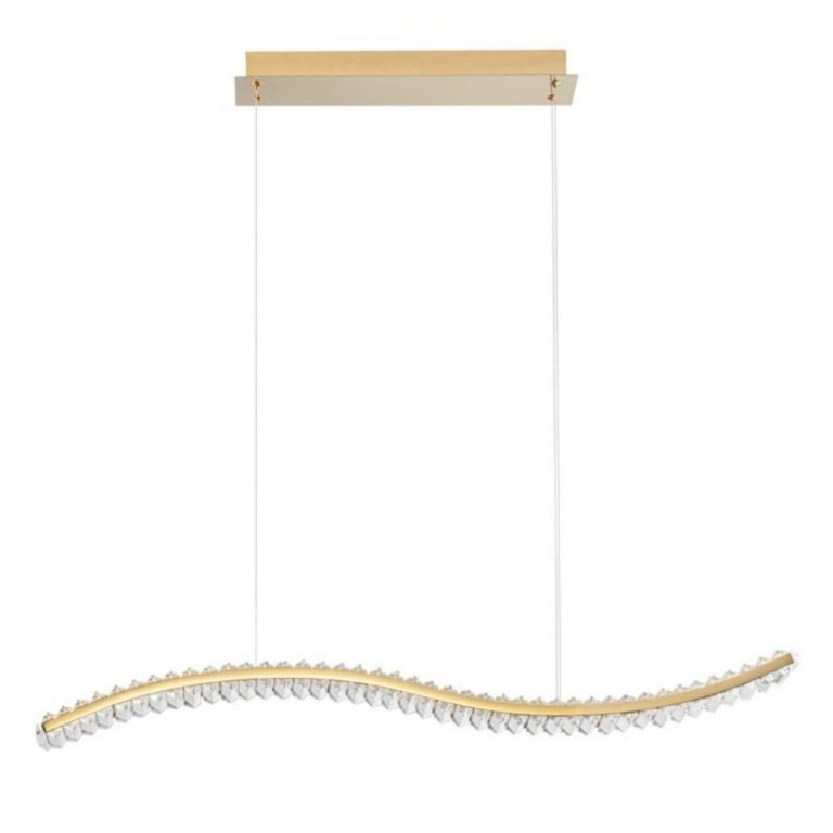 Wisząca lampa w kształcie fali świetnie sprawdzi się w roli lampy nad stół lub blat barowy, a także jako centralne źródło światła w salonie lub sypialni. Polecamy ten szklany żyrandol szczególnie do nowoczesnych wnętrz o charakterze formalnym i eleganckim, a także do salonu w stylu glamour lub art deco. Szklane elementy lampy oraz jej złote wykończenie pasować będą przede wszystkim do jasnych i ciepłych tonacji. Będziesz zachwycony jak nasza lampa wisząca o nietypowym kształcie idealnie wpisze się w taką wytworną i luksusową estetykę.