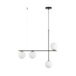 Lampa wisząca w nowoczesnym stylu Bera 4 wyposażona jest w stalowy stelaż w formie dwóch prętów (poziomego i pionowego), podsufitki oraz asymetrycznie ułożonych kloszy ze szkła. Polecane przez sklep Ryssa oświetlenie nad stół Bera 4 ma szerokość 74 cm oraz wysokość, którą można regulować. Maksymalna długość lampy wiszącej Bera 4 o asymetrycznej formie wynosi 110 cm. Możliwość zamontowania żarówek ściemniających jeszcze bardziej dodaje całej oprawie funkcjonalności.