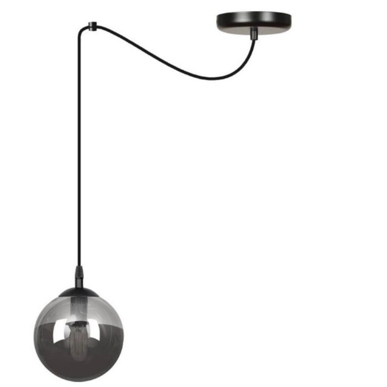 Najbardziej charakterystyczną cechą lampy wiszącej Blair Spider jest zdecydowanie jej przepiękny, szklany klosz w kulistym kształcie. Jego wysokość wynosi 14 cm (podobnie jak średnica podsufitki). Klosz ma oryginalny, grafitowy odcień, który przyciemnia światło, dając przyjemny i nastrojowy efekt. Tego rodzaju wykończenie doskonale pasuje do pozostałych elementów Blair Spider, które utrzymane są w czarnym kolorze.