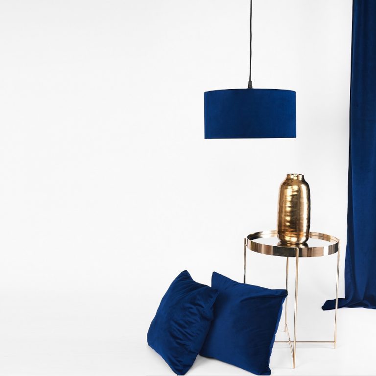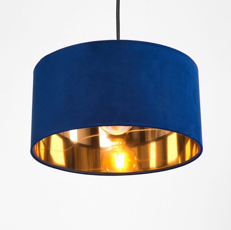 Niektóre elementy wyposażenia wnętrz, pomimo pozornie prostej i klasycznej formy, potrafią być bardzo eleganckimi i dekoracyjnymi przedmiotami. Taka właśnie jest wisząca lampa Florencja z lustrzanym wnętrzem i abażurem o tradycyjnej formie. Jednak zestawienie intensywnego, niebieskiego koloru tkaniny welurowej którą pokryty jest abażur, ze złotym lustrzanym i błyszczącym się środkiem, robi niesamowite wrażenie. Welur wnosi do wnętrz przytulny i ciepły klimat, a złote lustro dobrze odbijając światło pięknie rozjaśnia pomieszczenia. Niebieski kolor nadaje przestrzeni mocnego i wyrazistego charakteru.
