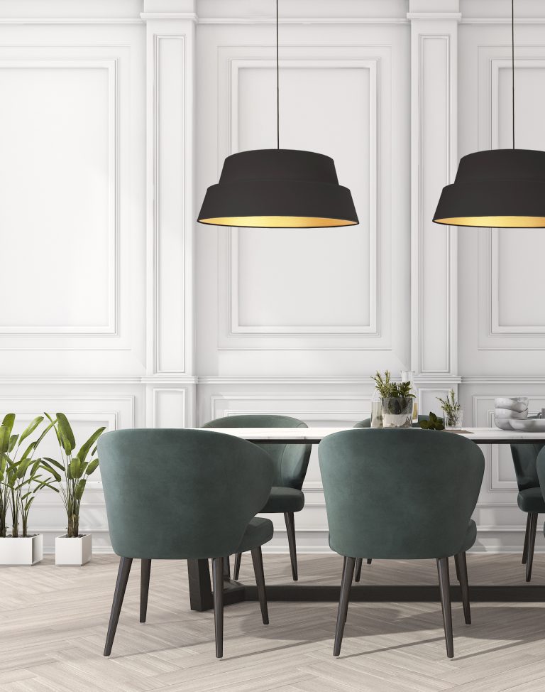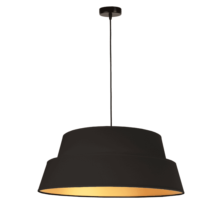Swoją uniwersalność zyskała nie tylko dzięki kolorystyce, ale także nieszablonowemu abażurowi. O ile czerń od zawsze kojarzy się z prostotą i elegancją, o tyle złoto jest symbolem bogactwa i przepychu. W tym wypadku kolory te równoważą się nawzajem, tworząc spójną, stonowaną całość.