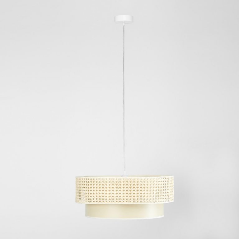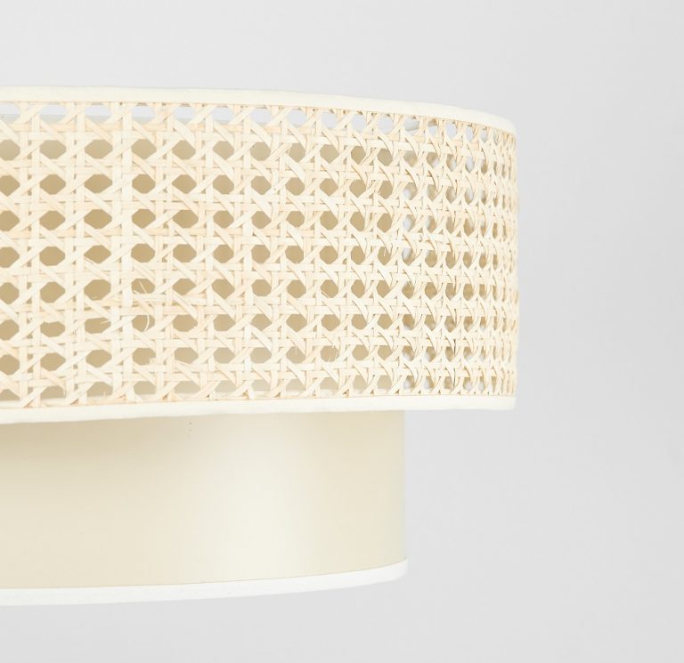 Klasyczne oświetlenie sufitowe wcale nie musi odbiegać od nowoczesnych trendów. Wisząca lampa z podwójnym abażurem Jakarta to kwintesencja połączenia tradycyjnej stylowości z nowoczesnym sznytem. Podstawowy, wewnętrzny abażur w kolorze jasnego kremu jest prosty i delikatnie błyszczący. To co nadaje tej lampie wyjątkowości to drugi, zewnętrzny abażur z kremowego rattanu. Jest szerszy ale krótszy, struktura z dziurkami świetnie wygląda na gładkim tle i sprawia, że tworzy się na nim naturalny światłocień. Takie połączenie wygląda wyjątkowo dobrze, a nieco ciemniejsze, metaliczne wnętrze abażuru stanowi ciekawy kontrast, nadając lampie nieco bardziej wyrazistego charakteru.