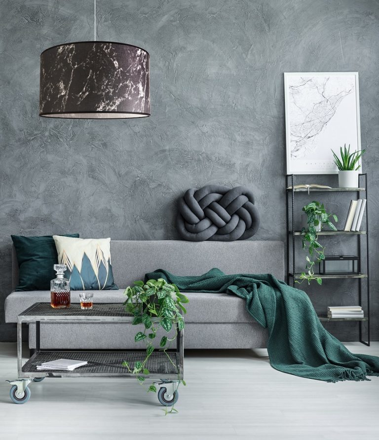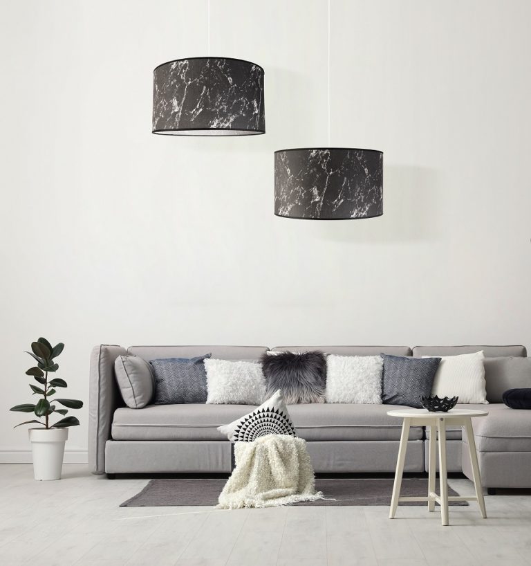 Marble świetnie sprawdzi się we wnętrzach urządzonych w stylu glamour, klasycznym czy też nowoczesnym. Każdej aranżacji nada wyjątkowy charakter. Abażur lampy wiszącej został wykonany z wysokiej jakości tkaniny bawełnianej. Choć przeważa w niej kolor biały, dzięki marmurowi staje się nieszablonowa. Dzięki grubości tkaniny światło żarówki może przebijać się przez materiał i wydostawać się na zewnątrz tworząc delikatną poświatę naokoło abażuru.