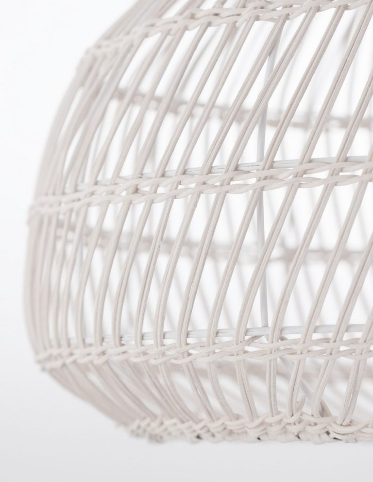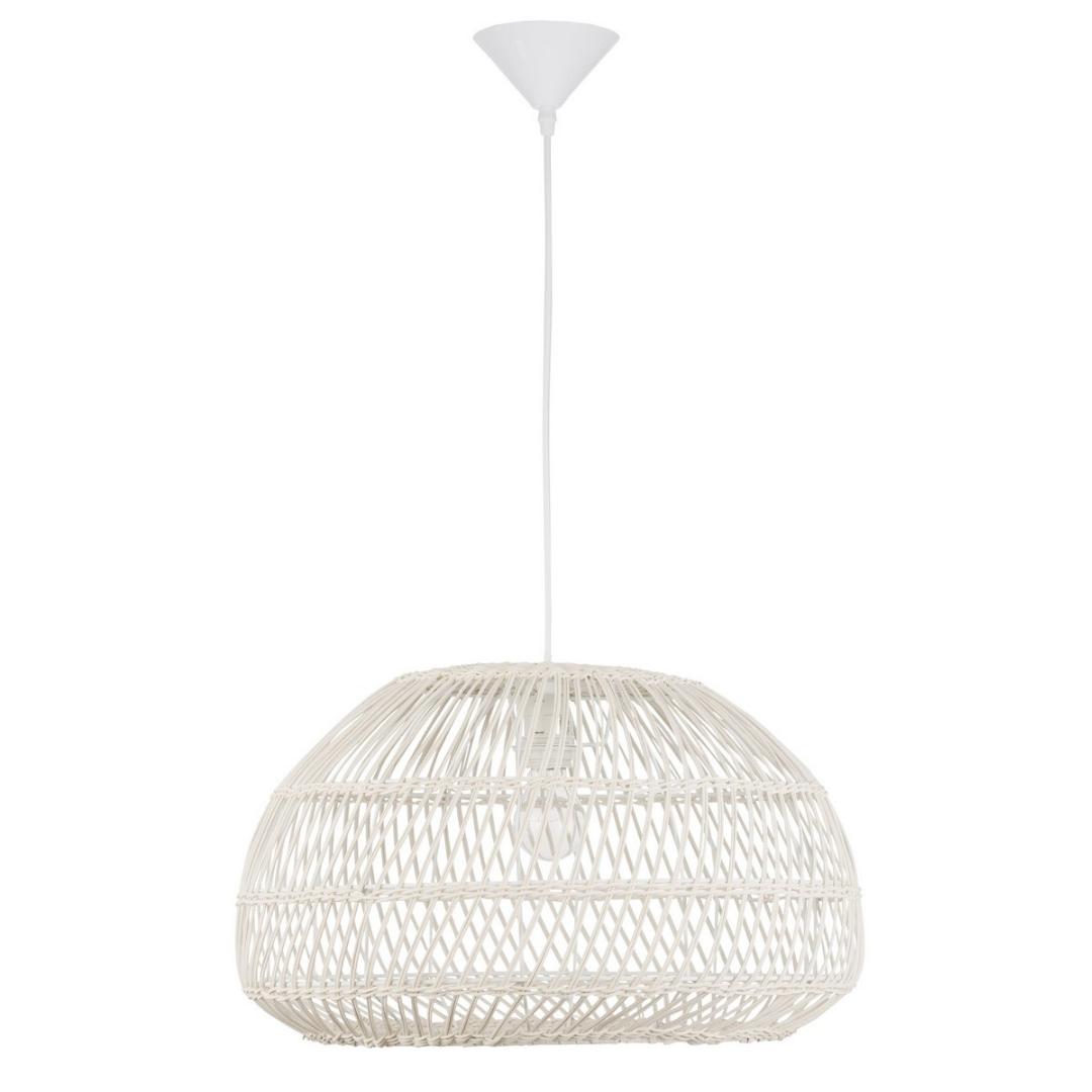 Oto lampa wisząca na białym stelażu, która zachwyca zwiewną i delikatną formą. Od stożkowej podsufitki odchodzi regulowany przewód w oplocie, który zwieńczony jest charakterystycznym kloszem w kształcie odwróconej misy. Uwagę zwraca nie tylko rozłożysta forma dużego abażura, ale również koronkowy splot wykonany z rattanu oraz piękny biały kolor. Dzięki takim detalom nasza pojedyncza lampa sufitowa jest oświetleniem niebanalnym, a przy tym również uniwersalnym i bardzo estetycznym.