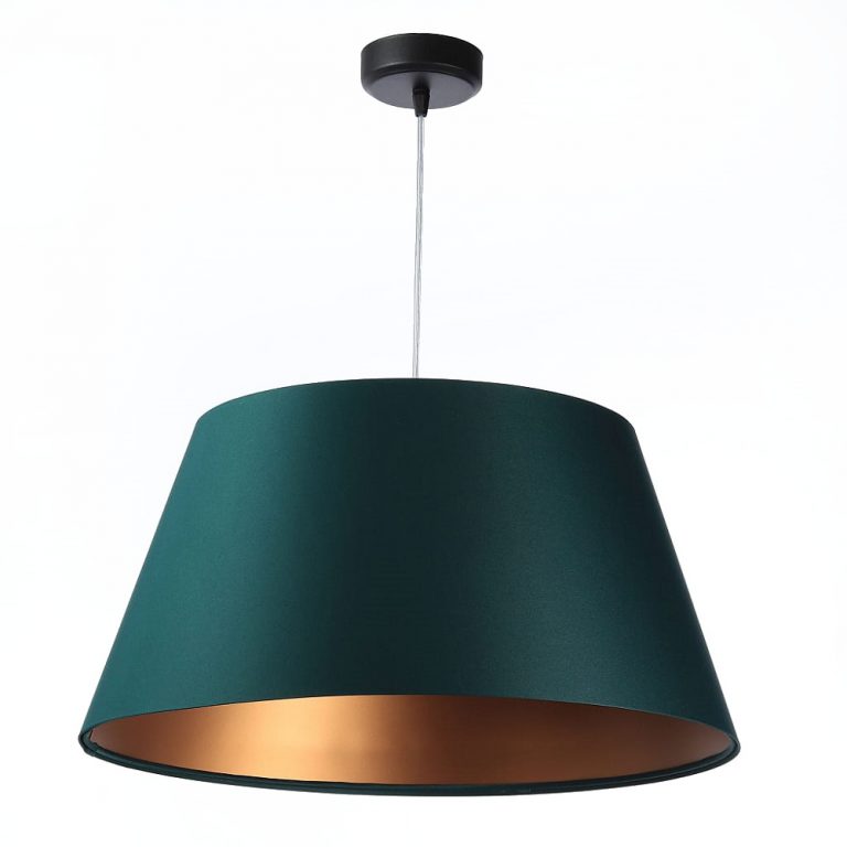 Lampa sufitowa z abażurem w kolorze butelkowej zieleni świetnie sprawdzi się do wnętrz z elementami i dodatkami o takiej barwie. Tak ciemny kolor nie jest stosowany na dużych powierzchniach, może to być na przykład jedna ściana albo kanapa w kolorze butelkowej zieleni, poduszki, tkaniny i dekoracje. Taki abażur będzie pięknie pasował do całości.